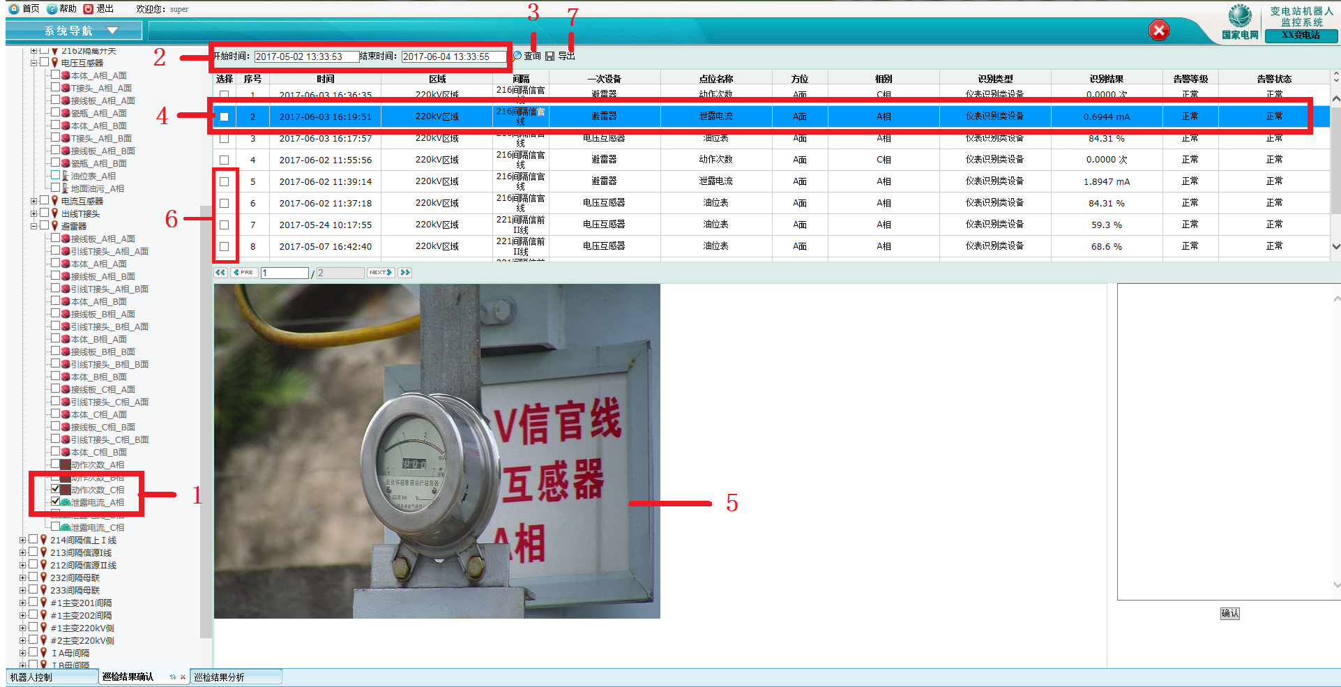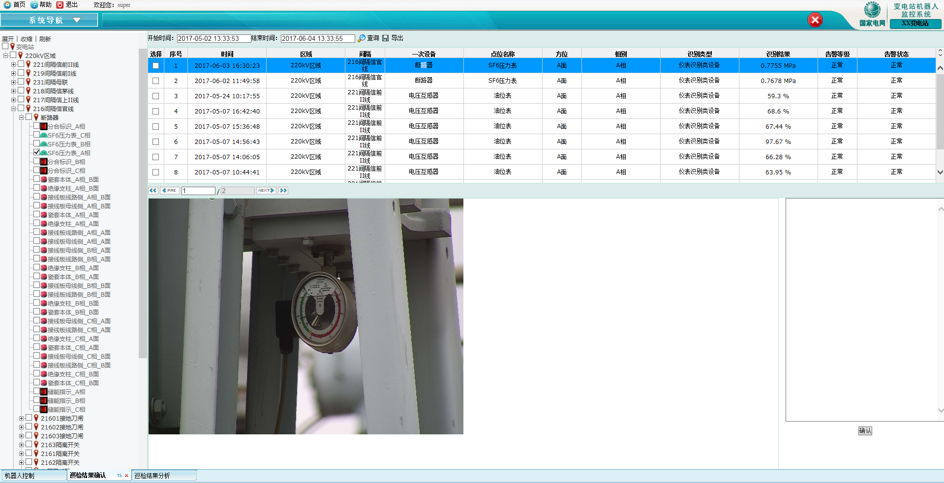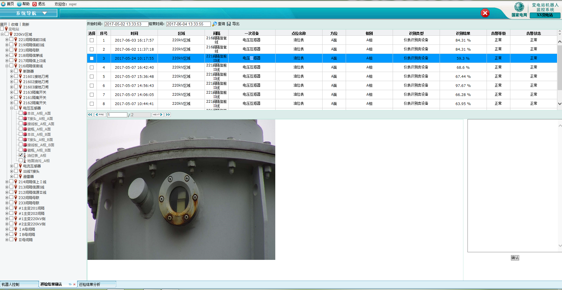 3)點擊『查詢』按鈕實現查詢將顯示所有的巡檢結果記錄,在下方頁面將顯示所有要搜索的巡檢信息(如巡檢時間、所在區域、間隔、一次設備、點位名稱、方位、相別、識別結果、告警等級、告警狀態);