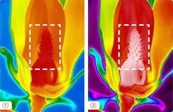 1.熱靈敏度決定熱像儀區分細做溫差的能力。同樣情況圖2所用熱像儀的熱靈敏度更低,畫面清晰顯示花蕊細節的溫度分布,而圖1同區域只能看到一片紅色。