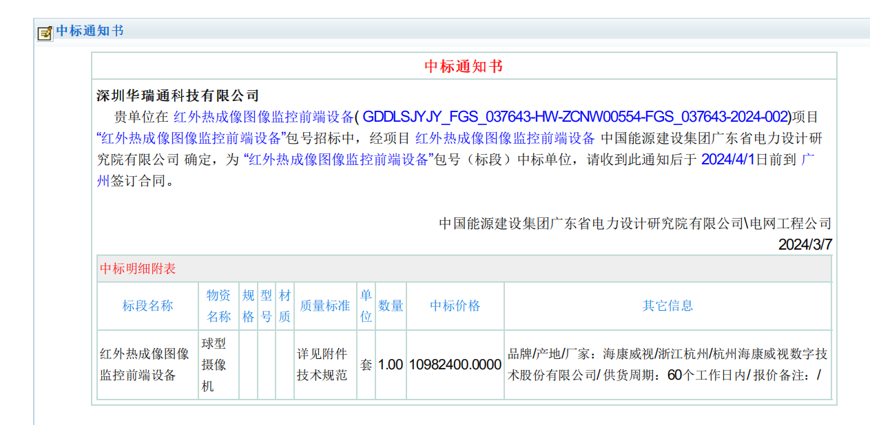 深圳華瑞通科技有限公司在紅外熱成像圖像監(jiān)控前端設(shè)備(GDDLSJYJY FGS 037643-HW-ZCNV00554-FGS 037643-2024-002)項目紅外熱成像圖像監(jiān)控前端設(shè)備"包號招標(biāo)中,經(jīng)項目 紅外熱成像圖像監(jiān)控前端設(shè)備 中國能源建設(shè)集團(tuán)廣東省電力設(shè)計研究院有限公司 確定,為“紅外熱成像圖像監(jiān)控前端設(shè)備"包號(標(biāo)段)中標(biāo)單位。