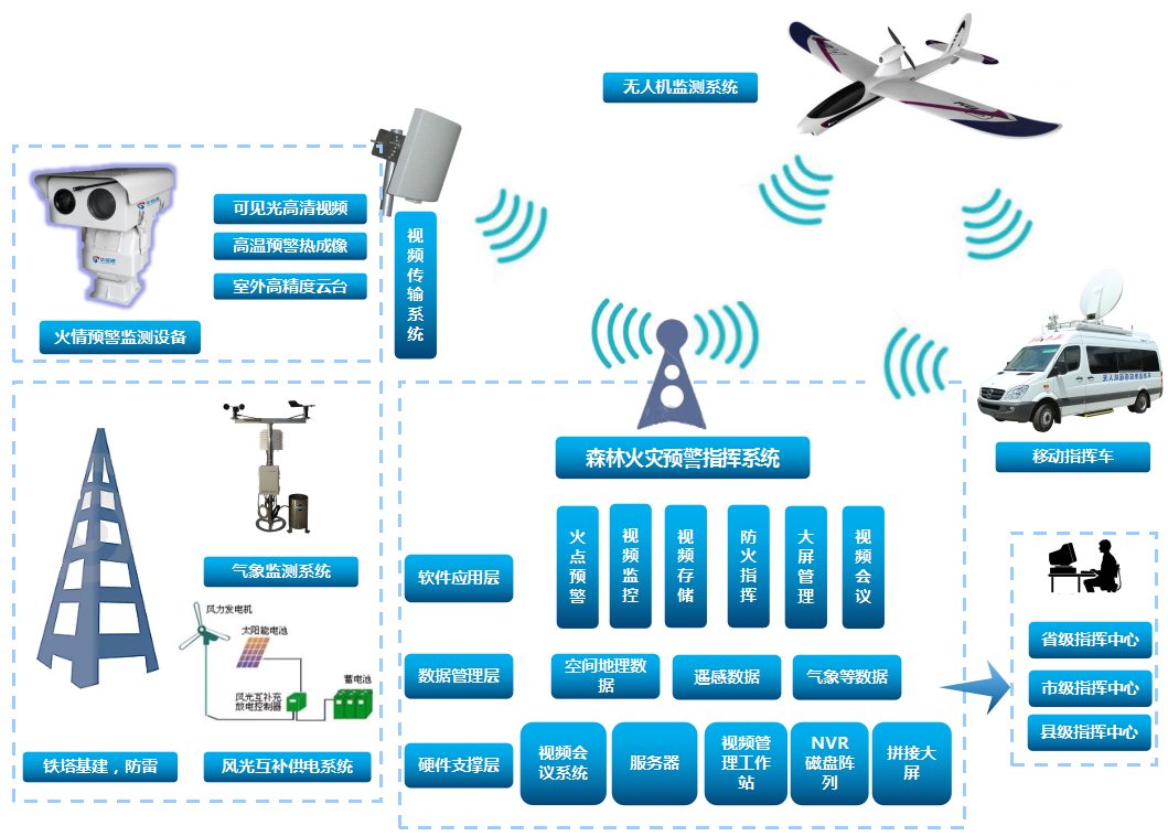 視頻監控技術采用攝像機作為視頻圖像傳感器,用于采集監控現場的信息;無線視頻監控終端作為視頻采集、視頻疊加、語音及對講、報警、GPS定位、抓拍、云臺控制、硬盤存儲、SD卡存儲及遠程視頻回放等。視頻監控為森林防火提供了數字化和網絡化的管理,系統具有林火自動識別功能,實現火情自動報警,林火火點電子地圖精確定位,通過專線傳回縣森林消防指揮中心,由縣森防指統一指揮,實時監控,實時預警,實時調度,做到森林火情早發現、早處置、早撲救,以確保全縣森林資源安全。