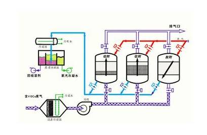 當炭吸附達到飽和后,對飽和的炭床進行脫附再生;通入水蒸汽加熱炭層,VOC被吹脫放出,并與水蒸汽形成蒸汽混合物,一起離開炭吸附床,用冷凝器冷卻蒸汽混合物,使蒸汽冷凝為液體。
