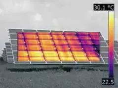 隨著溫度的升高,太陽(yáng)能電池板的效率會(huì)降低,發(fā)電量減少。有些缺陷會(huì)導(dǎo)致它們發(fā)生故障,甚至產(chǎn)生逆向電流,損壞整個(gè)太陽(yáng)能裝置。熱像儀可從遠(yuǎn)距離探測(cè)到電池板上的熱點(diǎn),這使得缺陷查找大為簡(jiǎn)化,防止缺陷變成毀滅性故障。