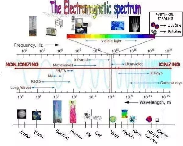 電磁輻射擁有波粒二相性,從量子理論來看,電磁波由光子級成,光子的能量與電磁輻射的頻率成正比。根據(jù)普朗克-愛因斯坦關(guān)系式,光子的能量是E=hv;其中,E是能量,h是普朗克常數(shù),v是頻率。在醫(yī)學(xué)影像學(xué)中一般指高能射線,這里能量指的是電磁波中每個(gè)光子的能量,因此頻率越高能量越高,X射線、阿爾法射線、貝塔射線、伽瑪射線因?yàn)轭l率極高,又稱高能射線。電磁波的波長理論上可以從最小的普朗克尺度到最大的宇宙尺度。