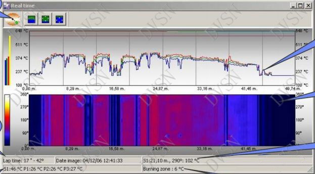 根據(jù)危廢燃燒在轉(zhuǎn)窯的燃燒階段過程不同至少劃分干燥、熱解、燃燒、燃盡四個(gè)區(qū)域,并實(shí)時(shí)顯示各個(gè)區(qū)域的最高溫度和最低溫度,同時(shí)可以讀取對(duì)每個(gè)區(qū)域的任意一點(diǎn)溫度值,也可以靈活顯示點(diǎn)溫,線溫等;